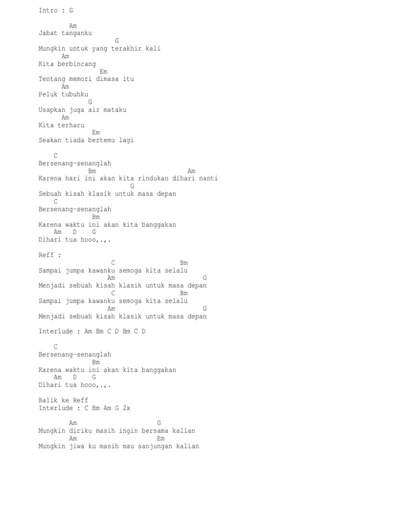 Lagu ini menceritakan kyung masa-masa akhir circa sebuah pertemuan yang sebantar lagi akan digantikan sebuah perpisahan. Kunci Gitar Sheila On 7 Sebuah Kisah Klasik dilengkapi dengan lirik lagu serta Transpose Tools yang bisa merubah tingkat nada dasar lagu. Jabat tanganku Mungkin untuk yang terakhir kali Kita berbincang Tentang memori di masa itu Peluk tubuhku Usapkan juga air mataku.